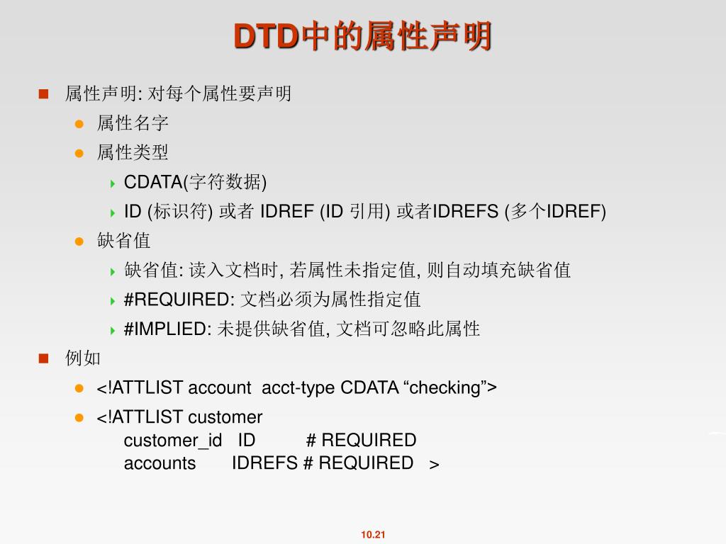 DTD中的元素说明 • 元素可定义为 • 嵌套子元素正则表达式, 或者 • #PCDATA (parsed character data), 即文本数据内容 • EMPTY (无内容) 或ANY (任何东西都可作为子元素) • 未加以定义的元素等价于显式定义为ANY类型 • 例如 <! ELEMENT depositor (customer-name, account-number)> <! ELEMENT customer-name(#PCDATA)> <! ELEMENT account-number (#PCDATA)> • 子元素定义的正则表达式 <!ELEMENT bank ( ( account | customer | depositor)+)> • 表示法: • “|” - 可替换选择(or) • “+” - 出现1 次以上 • “*” - 出现0 次以上 • “?” - 出现0 次或1次