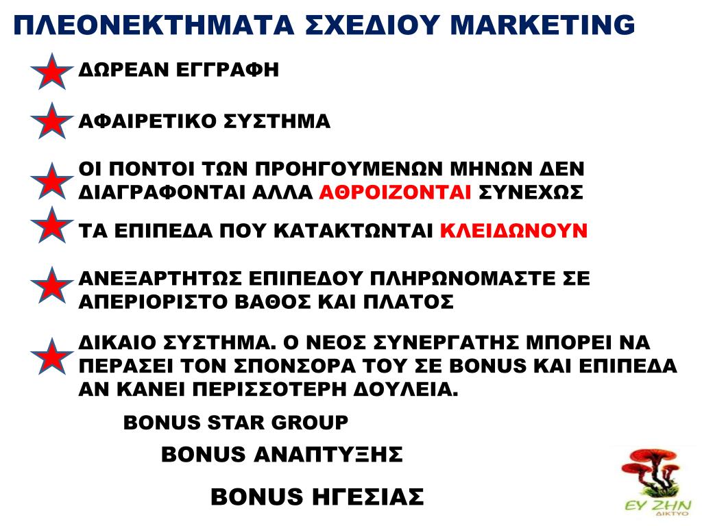 ΠΛΕΟΝΕΚΤΗΜΑΤΑ ΣΧΕΔΙΟΥ MARKETING ΔΩΡΕΑΝ ΕΓΓΡΑΦΗ ΑΦΑΙΡΕΤΙΚΟ ΣΥΣΤΗΜΑ ΟΙ ΠΟΝΤΟΙ ΤΩΝ ΠΡΟΗΓΟΥΜΕΝΩΝ ΜΗΝΩΝ ΔΕΝ ΔΙΑΓΡΑΦΟΝΤΑΙ ΑΛΛΑ ΑΘΡΟΙΖΟΝΤΑΙ ΣΥΝΕΧΩΣ ΤΑ ΕΠΙΠΕΔΑ ΠΟΥ ΚΑΤΑΚΤΩΝΤΑΙ ΚΛΕΙΔΩΝΟΥΝ ΑΝΕΞΑΡΤΗΤΩΣ ΕΠΙΠΕΔΟΥ ΠΛΗΡΩΝΟΜΑΣΤΕ ΣΕ ΑΠΕΡΙΟΡΙΣΤΟ ΒΑΘΟΣ ΚΑΙ ΠΛΑΤΟΣ ΔΙΚΑΙΟ ΣΥΣΤΗΜΑ. Ο ΝΕΟΣ ΣΥΝΕΡΓΑΤΗΣ ΜΠΟΡΕΙ ΝΑ ΠΕΡΑΣΕΙ ΤΟΝ ΣΠΟΝΣΟΡΑ ΤΟΥ ΣΕ BONUS KAΙ ΕΠΙΠΕΔΑ ΑΝ ΚΑΝΕΙ ΠΕΡΙΣΣΟΤΕΡΗ ΔΟΥΛΕΙΑ. BONUS STAR GROUP BONUS ANAΠΤΥΞΗΣ BONUS ΗΓΕΣΙΑΣ