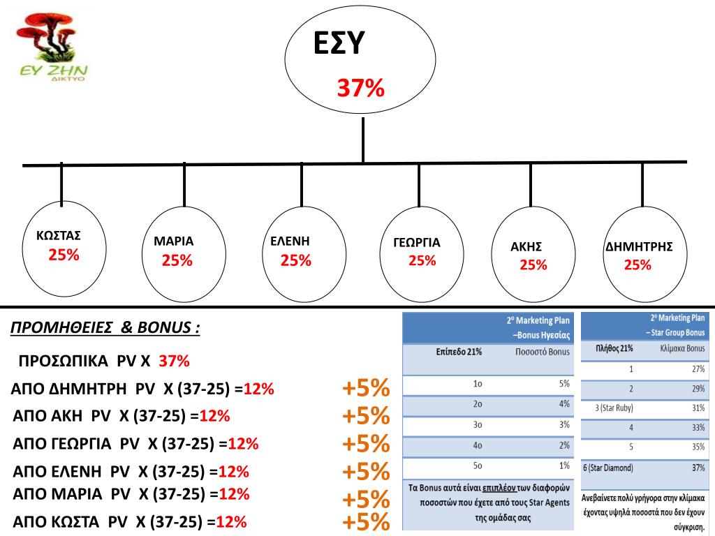 ΕΣΥ 37% ΚΩΣΤΑΣ 25% MAΡΙΑ 25% ΕΛΕΝΗ 25% ΓΕΩΡΓΙΑ 25% ΑΚΗΣ 25% ΔΗΜΗΤΡΗΣ 25% ΠΡΟΜΗΘΕΙΕΣ & BONUS : ΠΡΟΣΩΠΙΚΑ PV Χ 37% +5% ΑΠO ΔΗΜΗΤΡΗ PV X (37-25) =12% +5% ΑΠO ΑΚΗ PV X (37-25) =12% +5% ΑΠO ΓΕΩΡΓΙΑ PV X (37-25) =12% +5% ΑΠO ΕΛΕΝΗ PV X (37-25) =12% +5% ΑΠO ΜΑΡΙΑ PV X (37-25) =12% +5% ΑΠO ΚΩΣΤΑ PV X (37-25) =12%