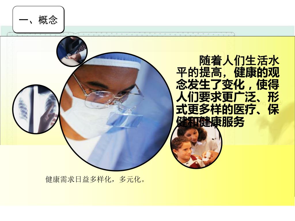 健康需求日益多样化,多元化。 一、概念 随着人们生活水平的提高,健康的观念发生了变化,使得人们要求更广泛、形式更多样的医疗、保健和健康服务