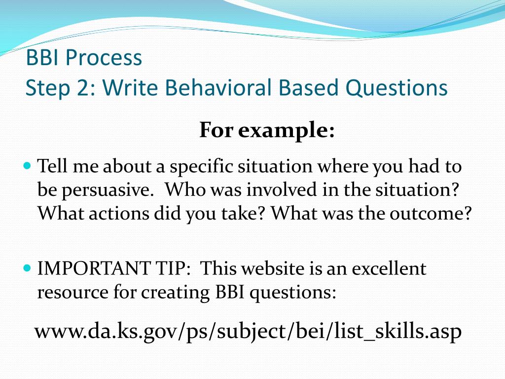 BBI ProcessStep 2: Write Behavioral Based Questions For example: • Tell me about a specific situation where you had to be persuasive. Who was involved in the situation? What actions did you take? What was the outcome? • IMPORTANT TIP: This website is an excellent resource for creating BBI questions: www.da.ks.gov/ps/subject/bei/list_skills.asp