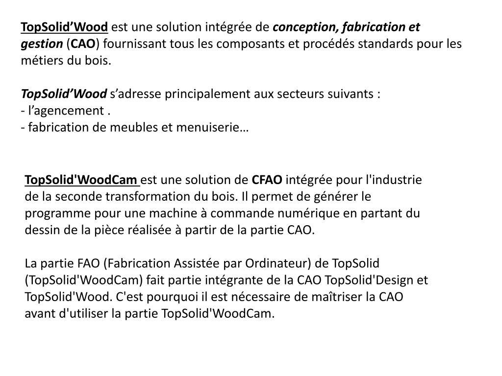 TopSolid’Woodest une solution intégrée de conception, fabrication et gestion (CAO) fournissant tous les composants et procédés standards pour les métiers du bois. • TopSolid’Wood s’adresse principalement aux secteurs suivants : • - l’agencement . • fabrication de meubles et menuiserie… TopSolid'WoodCam est une solution de CFAO intégrée pour l'industrie de la seconde transformation du bois. Il permet de générer le programme pour une machine à commande numérique en partant du dessin de la pièce réalisée à partir de la partie CAO. La partie FAO (Fabrication Assistée par Ordinateur) de TopSolid (TopSolid'WoodCam) fait partie intégrante de la CAO TopSolid'Design et TopSolid'Wood. C'est pourquoi il est nécessaire de maîtriser la CAO avant d'utiliser la partie TopSolid'WoodCam.