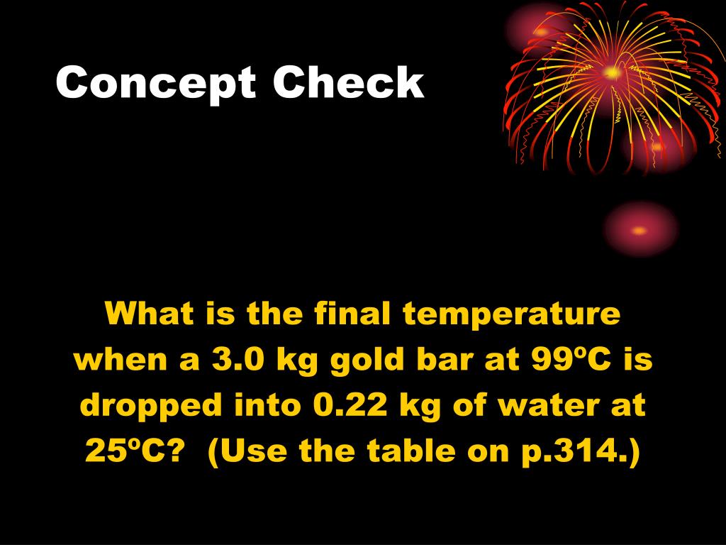 Concept Check What is the final temperature when a 3.0 kg gold bar at 99ºC is dropped into 0.22 kg of water at 25ºC? (Use the table on p.314.)