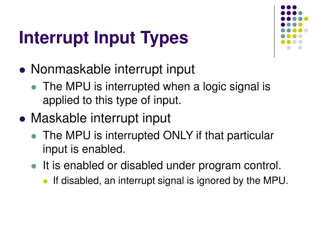 Interrupt Input Types • Nonmaskable interrupt input • The MPU is interrupted when a logic signal is applied to this type of input. • Maskable interrupt input • The MPU is interrupted ONLY if that particular input is enabled. • It is enabled or disabled under program control. • If disabled, an interrupt signal is ignored by the MPU.