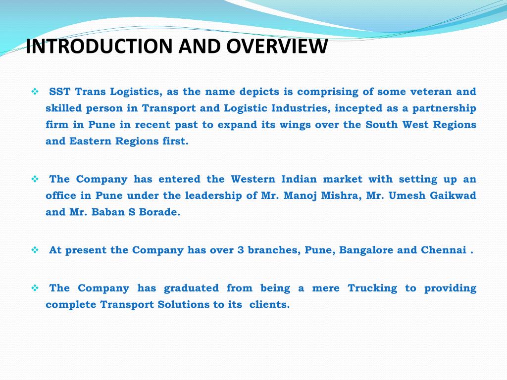 INTRODUCTION AND OVERVIEW • SST Trans Logistics, as the name depicts is comprising of some veteran and skilled person in Transport and Logistic Industries, incepted as a partnership firm in Pune in recent past to expand its wings over the South West Regions and Eastern Regions first. • The Company has entered the Western Indian market with setting up an office in Pune under the leadership of Mr. ManojMishra, Mr. UmeshGaikwad and Mr. Baban S Borade. • At present the Company has over 3 branches, Pune, Bangalore and Chennai . • The Company has graduated from being a mere Trucking to providing complete Transport Solutions to its clients.
