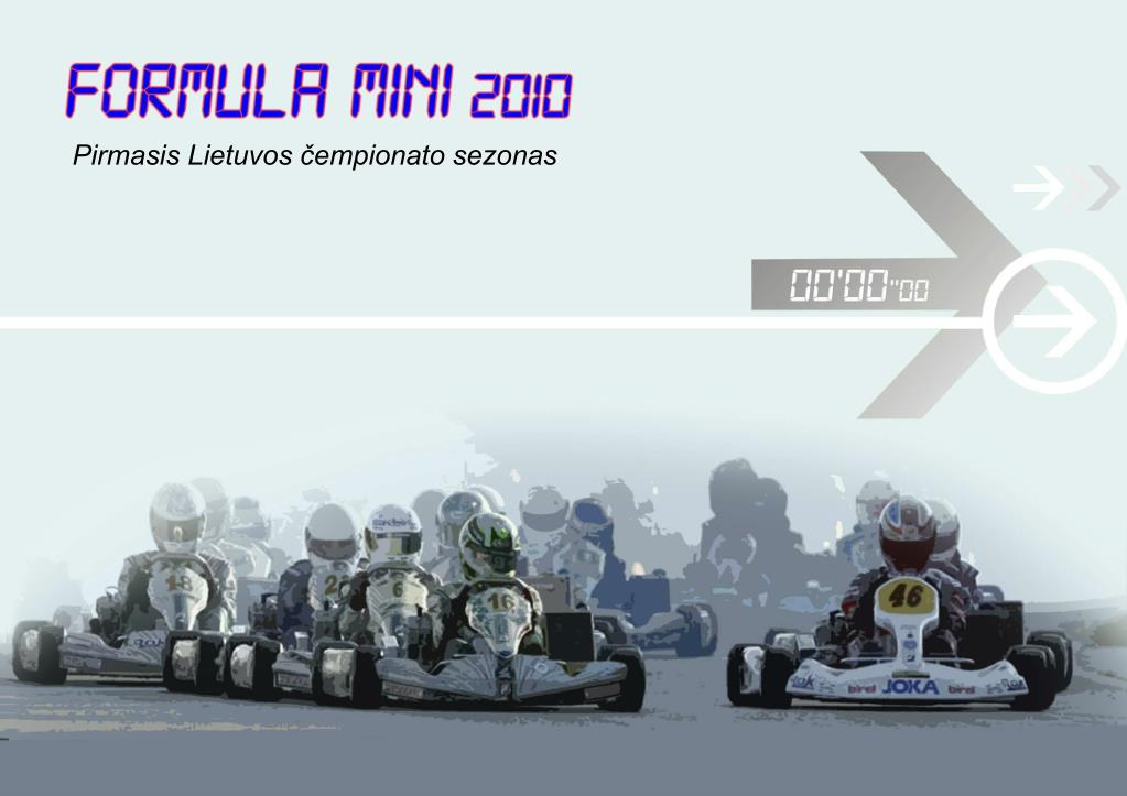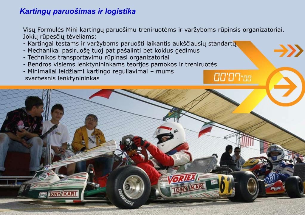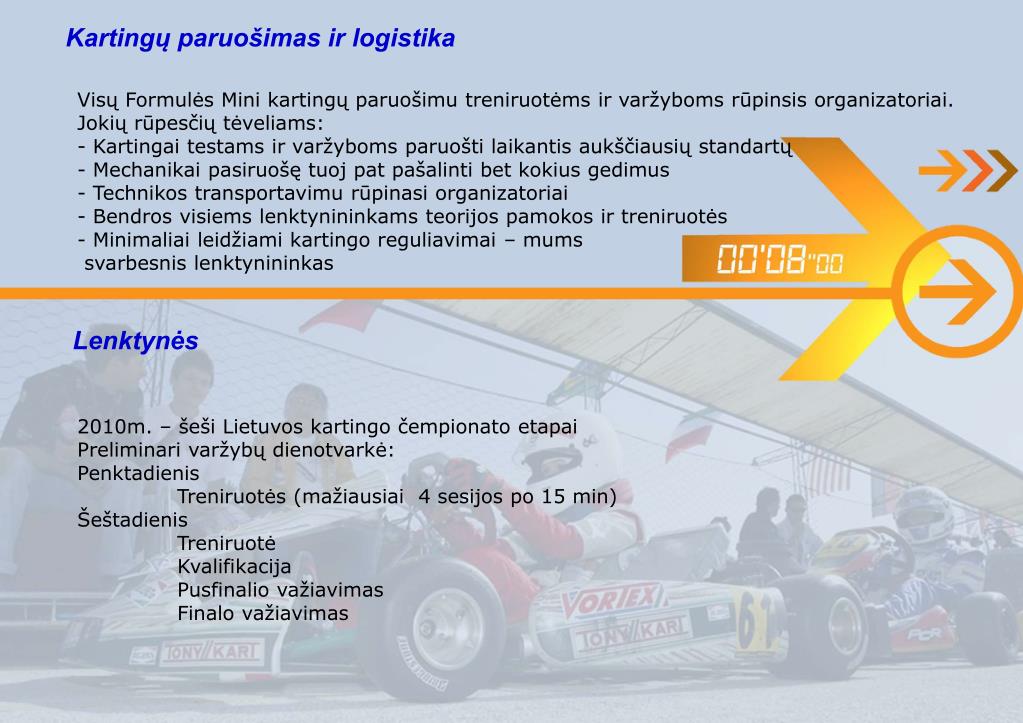 Kartingų paruošimas ir logistika Visų Formulės Mini kartingų paruošimu treniruotėms ir varžyboms rūpinsis organizatoriai. Jokių rūpesčių tėveliams: - Kartingai testams ir varžyboms paruošti laikantis aukščiausių standartų - Mechanikai pasiruošę tuoj pat pašalinti bet kokius gedimus - Technikos transportavimu rūpinasi organizatoriai - Bendros visiems lenktynininkams teorijos pamokos ir treniruotės - Minimaliai leidžiami kartingo reguliavimai – mums svarbesnis lenktynininkas Lenktynės 2010m. – šeši Lietuvos kartingo čempionato etapai Preliminari varžybų dienotvarkė: Penktadienis Treniruotės (mažiausiai 4 sesijos po 15 min) Šeštadienis Treniruotė Kvalifikacija Pusfinalio važiavimas Finalo važiavimas