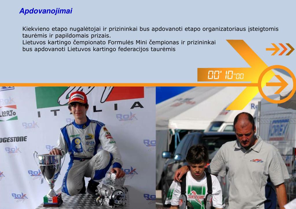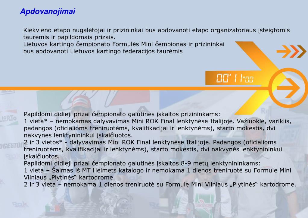 Apdovanojimai Kiekvieno etapo nugalėtojai ir prizininkai bus apdovanoti etapo organizatoriaus įsteigtomis taurėmis ir papildomais prizais. Lietuvos kartingo čempionato Formulės Mini čempionas ir prizininkai bus apdovanoti Lietuvos kartingo federacijos taurėmis Papildomi didieji prizai čempionato galutinės įskaitos prizininkams: 1 vieta* – nemokamas dalyvavimas Mini ROK Final lenktynėse Italijoje. Važiuoklė, variklis, padangos (oficialioms treniruotėms, kvalifikacijai ir lenktynėms), starto mokestis, dvi nakvynės lenktynininkui įskaičiuotos. 2 ir 3 vietos* - dalyvavimas Mini ROK Final lenktynėse Italijoje. Padangos (oficialioms treniruotėms, kvalifikacijai ir lenktynėms), starto mokestis, dvi nakvynės lenktynininkui įskaičiuotos. Papildomi didieji prizai čempionato galutinės įskaitos 8-9 metų lenktynininkams: 1 vieta – Šalmas iš MT Helmets katalogo ir nemokama 1 dienos treniruotė su Formule Mini Vilniaus „Plytinės“ kartodrome. 2 ir 3 vieta – nemokama 1 dienos treniruotė su Formule Mini Vilniaus „Plytinės“ kartodrome.