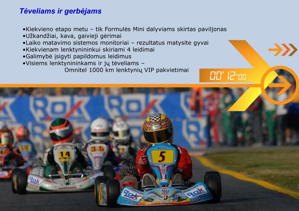 Tėveliams ir gerbėjams • Kiekvieno etapo metu – tik Formulės Mini dalyviams skirtas paviljonas • Užkandžiai, kava, gaivieji gėrimai • Laiko matavimo sistemos monitoriai – rezultatus matysite gyvai • Kiekvienam lenktynininkui skiriami 4 leidimai • Galimybė įsigyti papildomus leidimus • Visiems lenktynininkams ir jų tėveliams – • Omnitel 1000 km lenktynių VIP pakvietimai