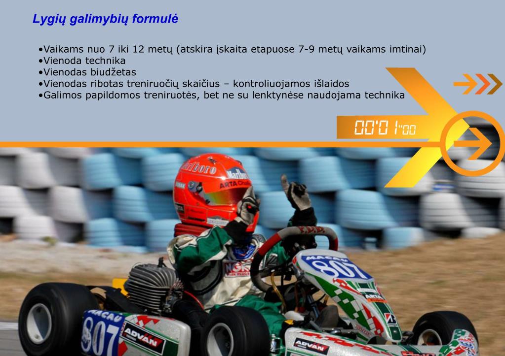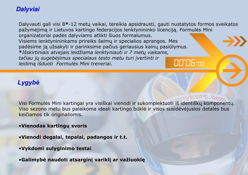Dalyviai Dalyvauti gali visi 8*-12 metų vaikai, tereikia apsidrausti, gauti nustatytos formos sveikatos pažymėjimą ir Lietuvos kartingo federacijos lenktynininko licenciją. Formulės Mini organizatoriai padės dalyviams atlikti šiuos formalumus. Visiems lenktynininkams prireiks šalmų ir specialios aprangos. Mes padėsime ją užsakyti ir parinksime pačius geriausius kainų pasiūlymus. *Išskirtiniais atvejais leidžiama lenktyniauti ir 7 metų vaikams, tačiau jų sugebėjimus specialaus testo metu turi įvertinti ir leidimą išduoti Formulės Mini treneriai. Lygybė • Visi Formulės Mini kartingai yra visiškai vienodi ir sukomplektuoti iš identiškų komponentų. Viso sezono metu bus palaikoma ideali kartingo būklė ir visos susidėvėjusios detalės bus keičiamos tik originaliomis. • Vienodas kartingų svoris • Vienodi degalai, tepalai, padangos ir t.t. • Vykdomi sulyginimo testai • Galimybė naudoti atsarginį variklį ar važiuoklę