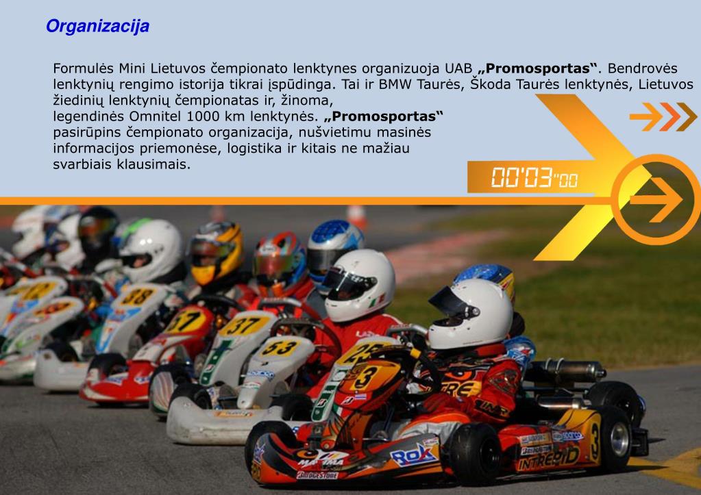 Organizacija Formulės Mini Lietuvos čempionato lenktynes organizuoja UAB „Promosportas“. Bendrovės lenktynių rengimo istorija tikrai įspūdinga. Tai ir BMW Taurės, Škoda Taurės lenktynės, Lietuvos žiedinių lenktynių čempionatas ir, žinoma, legendinės Omnitel 1000 km lenktynės. „Promosportas“ pasirūpins čempionato organizacija, nušvietimu masinės informacijos priemonėse, logistika ir kitais ne mažiau svarbiais klausimais.