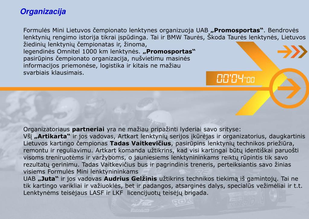 Organizacija Formulės Mini Lietuvos čempionato lenktynes organizuoja UAB „Promosportas“. Bendrovės lenktynių rengimo istorija tikrai įspūdinga. Tai ir BMW Taurės, Škoda Taurės lenktynės, Lietuvos žiedinių lenktynių čempionatas ir, žinoma, legendinės Omnitel 1000 km lenktynės. „Promosportas“ pasirūpins čempionato organizacija, nušvietimu masinės informacijos priemonėse, logistika ir kitais ne mažiau svarbiais klausimais. Organizatoriaus partneriai yra ne mažiau pripažinti lyderiai savo srityse: Všį „Artikarta“ ir jos vadovas, Artkart lenktynių serijos įkūrėjas ir organizatorius, daugkartinis Lietuvos kartingo čempionas Tadas Vaitkevičius, pasirūpins lenktynių technikos priežiūra, remontu ir reguliavimu. Artkart komanda užtikrins, kad visi kartingai būtų identiškai paruošti visoms treniruotėms ir varžyboms, o jauniesiems lenktynininkams reiktų rūpintis tik savo rezultatų gerinimu. Tadas Vaitkevičius bus ir pagrindinis treneris, perteiksiantis savo žinias visiems Formulės Mini lenktynininkams UAB „Juta“ ir jos vadovas Audrius Gelžinis užtikrins technikos tiekimą iš gamintojų. Tai ne tik kartingo varikliai ir važiuoklės, bet ir padangos, atsarginės dalys, specialūs vežimėliai ir t.t. Lenktynėms teisėjaus LASF ir LKF licencijuotų teisėjų brigada.