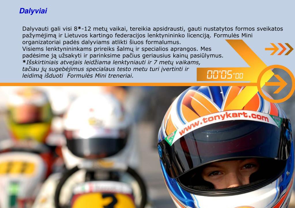 Dalyviai Dalyvauti gali visi 8*-12 metų vaikai, tereikia apsidrausti, gauti nustatytos formos sveikatos pažymėjimą ir Lietuvos kartingo federacijos lenktynininko licenciją. Formulės Mini organizatoriai padės dalyviams atlikti šiuos formalumus. Visiems lenktynininkams prireiks šalmų ir specialios aprangos. Mes padėsime ją užsakyti ir parinksime pačius geriausius kainų pasiūlymus. *Išskirtiniais atvejais leidžiama lenktyniauti ir 7 metų vaikams, tačiau jų sugebėjimus specialaus testo metu turi įvertinti ir leidimą išduoti Formulės Mini treneriai.