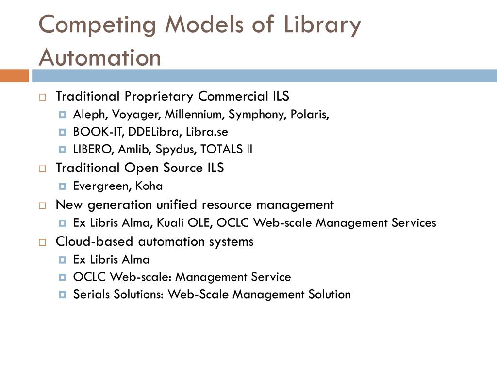 Competing Models of Library Automation • Traditional Proprietary Commercial ILS • Aleph, Voyager, Millennium, Symphony, Polaris, • BOOK-IT, DDELibra, Libra.se • LIBERO, Amlib, Spydus, TOTALS II • Traditional Open Source ILS • Evergreen, Koha • New generation unified resource management • Ex Libris Alma, Kuali OLE, OCLC Web-scale Management Services • Cloud-based automation systems • Ex Libris Alma • OCLC Web-scale: Management Service • Serials Solutions: Web-Scale Management Solution