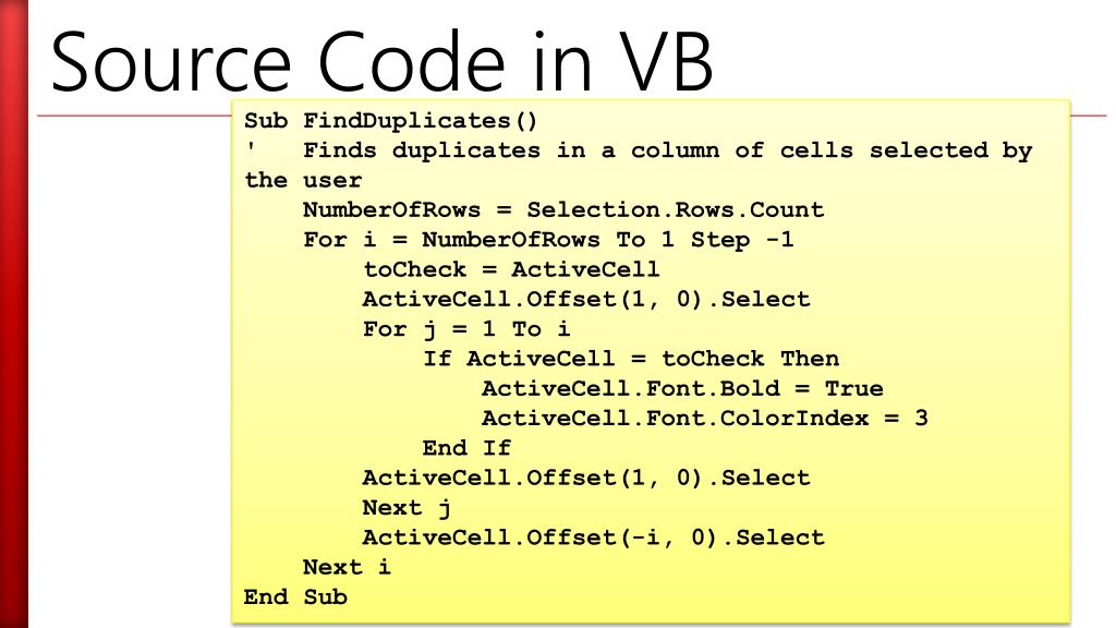 Source Code in VB Sub FindDuplicates() ' Finds duplicates in a column of cells selected by the user NumberOfRows = Selection.Rows.Count For i = NumberOfRows To 1 Step -1 toCheck = ActiveCell ActiveCell.Offset(1, 0).Select For j = 1 To i If ActiveCell = toCheck Then ActiveCell.Font.Bold = True ActiveCell.Font.ColorIndex = 3 End If ActiveCell.Offset(1, 0).Select Next j ActiveCell.Offset(-i, 0).Select Next i End Sub