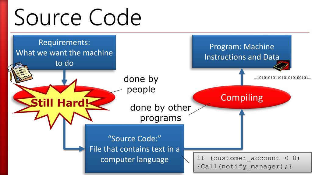 …10101010110101010100101… Source Code Requirements:What we want the machine to do Program: Machine Instructions and Data done by people Still Hard! Coding Compiling done by other programs “Source Code:” File that contains text in a computer language if (customer_account < 0) {Call(notify_manager);}