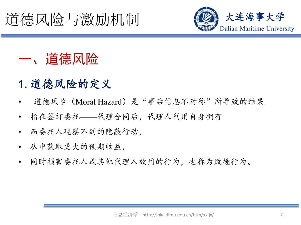 信息经济学. —— 道德风险与激励机制. 大连海事大学信息经济学课程组 课程网站: http://jpkc.dlmu.edu.cn/htm/xxjjx/. 道德风险与激励机制. 一、 道德风险 1. 道德风险的定义 道德风险( Moral Hazard ) 是“事后信息不对称”所导致的结果 指在签订委托 —— 代理合同后,代理人利用自身拥有 而委托人观察 不 到的隐蔽行动, 从中获取更大的预期收益, 同时损害委托人或其他代理人效用的行为,也 称为 败德行为。. 道德风险与激励机制. 一、 道德风险 2. 道德风险的举例 -1