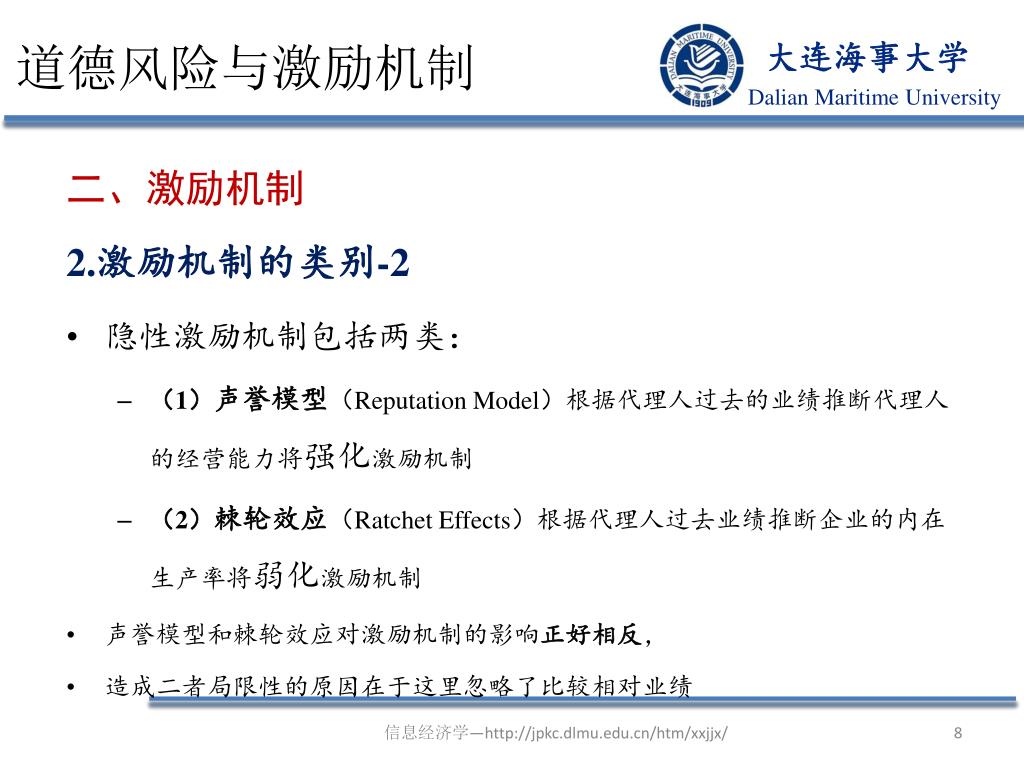 信息经济学 ——道德风险与激励机制 大连海事大学信息经济学课程组 课程网站:http://jpkc.dlmu.edu.cn/htm/xxjjx/