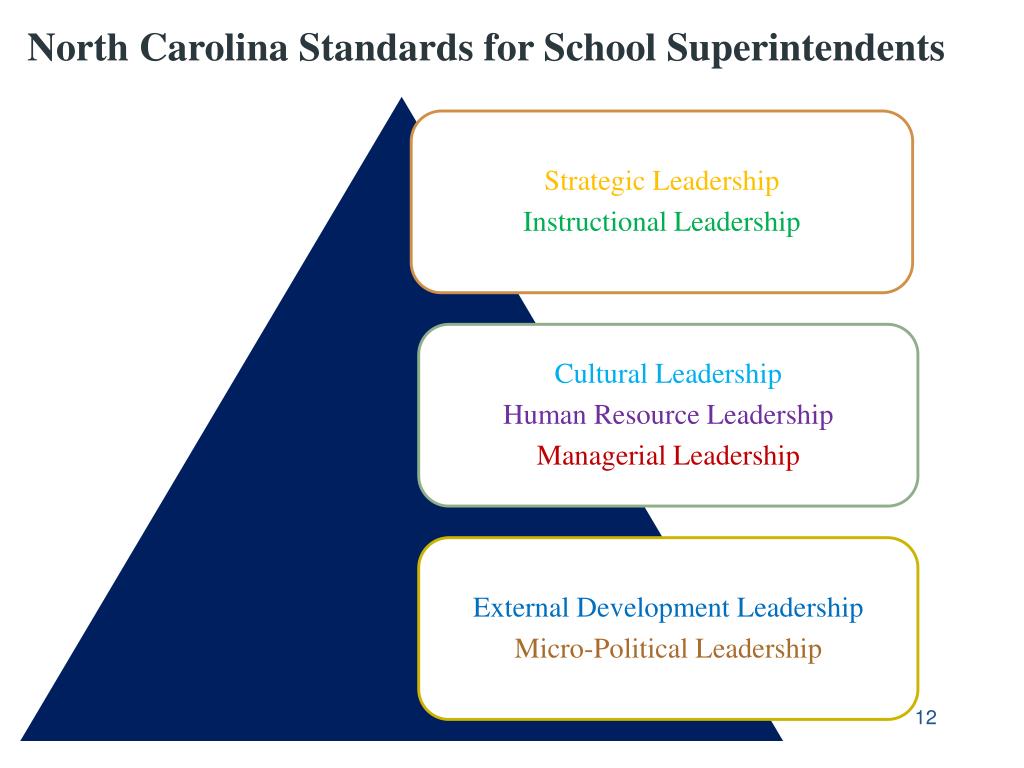 The Evaluation Process 1. Superintendent Self-Assessment 5. Final Evaluation and Goal-Setting Meeting 2. Meeting Between Superintendent and District School Board North Carolina Superintendent Evaluation Process 4. District School Board Rating of Superintendent 3. Consolidated Performance Assessment