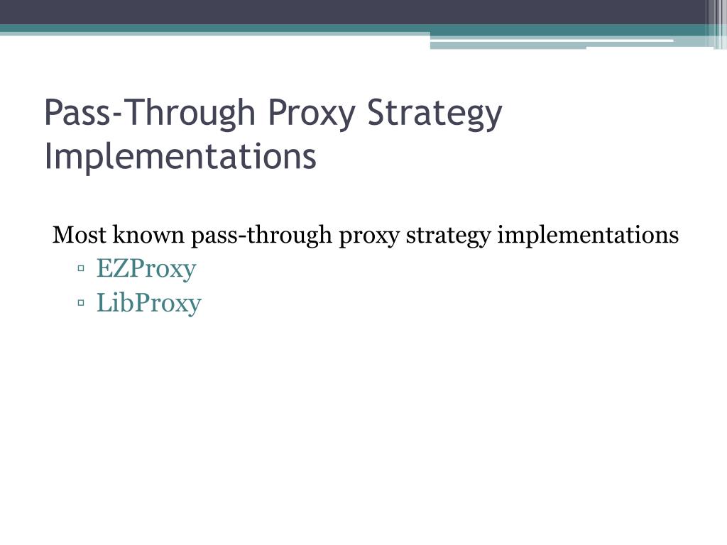Pass-Through Proxy Strategy Implementations Most known pass-through proxy strategy implementations • EZProxy • LibProxy