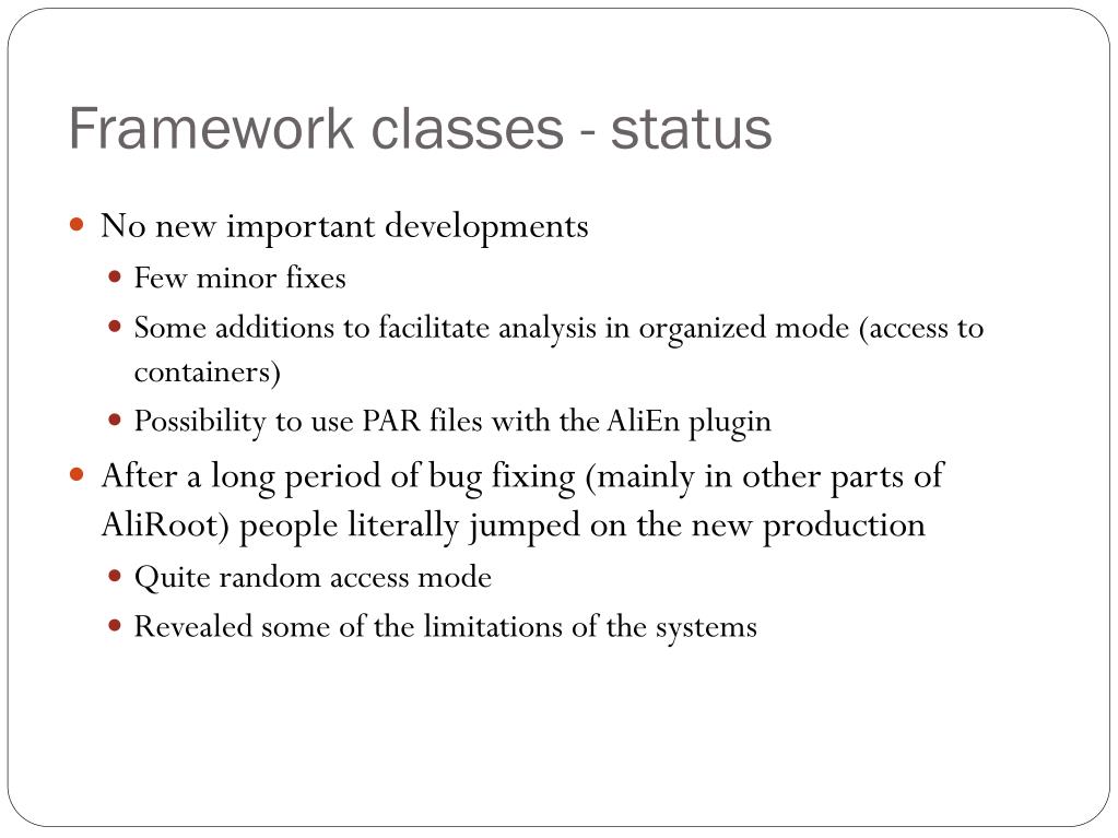 Framework classes - status • No new important developments • Few minor fixes • Some additions to facilitate analysis in organized mode (access to containers) • Possibility to use PAR files with the AliEn plugin • After a long period of bug fixing (mainly in other parts of AliRoot) people literally jumped on the new production • Quite random access mode • Revealed some of the limitations of the systems