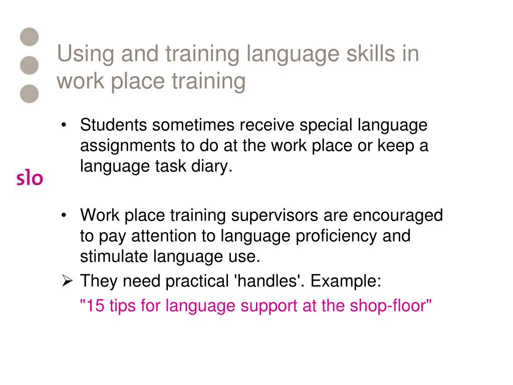 Using and training language skills in work place training • Students sometimes receive special language assignments to do at the work place or keep a language task diary. • Work place training supervisors are encouraged to pay attention to language proficiency and stimulate language use. • They need practical 'handles'. Example: "15 tips for language support at the shop-floor"