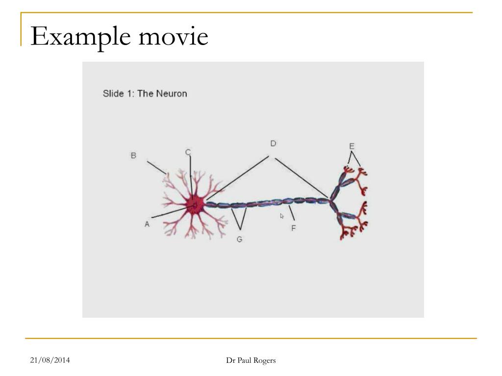 Instructions • For THREE of the slides in the PowerPoint presentation, you must create a Windows Media Encoder movie containing a description (maximum 500 words each) that includes the following: • Slide 1: Functioning along the neuron (33 marks) • Your movie should: • Name the structures A to G, then; • Using the diagram, explain: • How the action potential is initiated, and; • How the action potential is propagated along the axon. Dr Paul Rogers