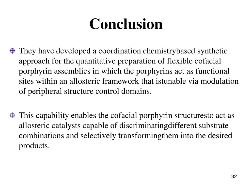 Conclusion • They have developed a coordination chemistrybased synthetic approach for the quantitative preparation of flexible cofacial porphyrin assemblies in which the porphyrins act as functional sites within an allosteric framework that istunable via modulation of peripheral structure control domains. • This capability enables the cofacial porphyrin structuresto act as allosteric catalysts capable of discriminatingdifferent substrate combinations and selectively transformingthem into the desired products.
