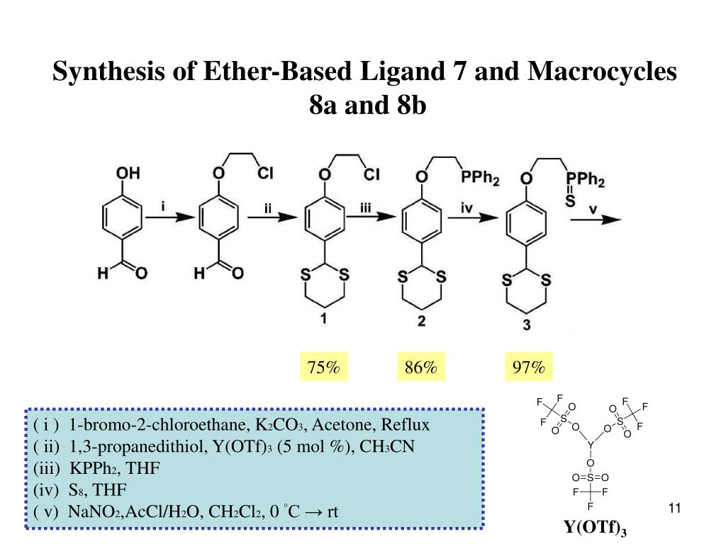 75% 86% 97% Y(OTf)3 Synthesis of Ether-Based Ligand 7 and Macrocycles 8a and 8b ( i ) 1-bromo-2-chloroethane, K2CO3, Acetone, Reflux ( ii) 1,3-propanedithiol, Y(OTf)3 (5 mol %), CH3CN (iii) KPPh2, THF (iv) S8, THF ( v) NaNO2,AcCl/H2O, CH2Cl2, 0 °C → rt