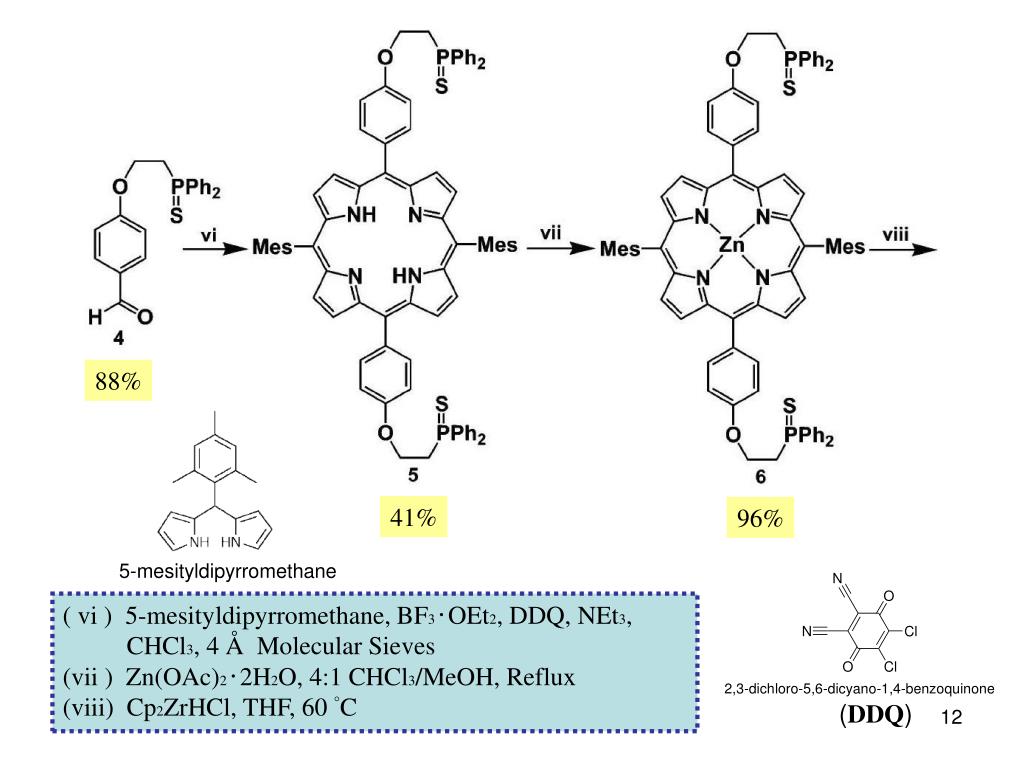 88% 41% 96% 5-mesityldipyrromethane (DDQ) ( vi ) 5-mesityldipyrromethane, BF3‧OEt2, DDQ, NEt3, CHCl3, 4 Å Molecular Sieves (vii ) Zn(OAc)2‧2H2O, 4:1 CHCl3/MeOH, Reflux (viii) Cp2ZrHCl, THF, 60 °C