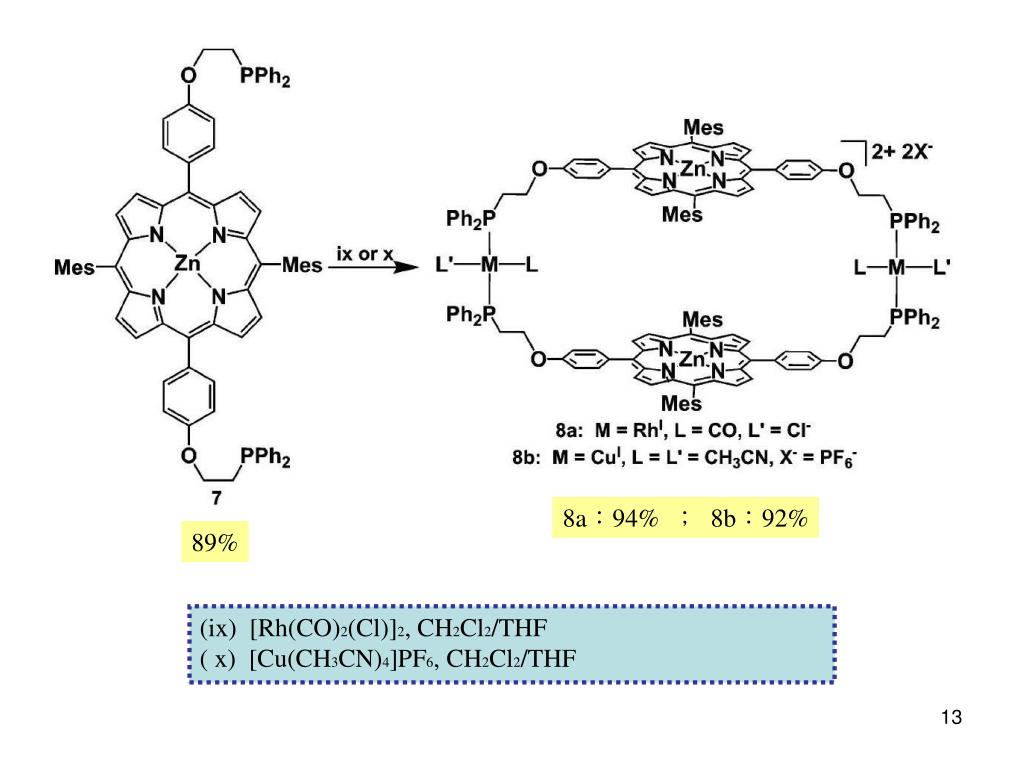 98% 88% ( v ) Zn(OAc)2‧2H2O, 4:1 CHCl3/MeOH, Reflux ( vi ) Cp2ZrHCl, THF, 60 °C ( vii) for 14a: [Rh(NBD)Cl]2, AgBF4, CH2Cl2/THF (viii) for 14b: [Cu(CH3CN)4]PF6, CH2Cl2/THF