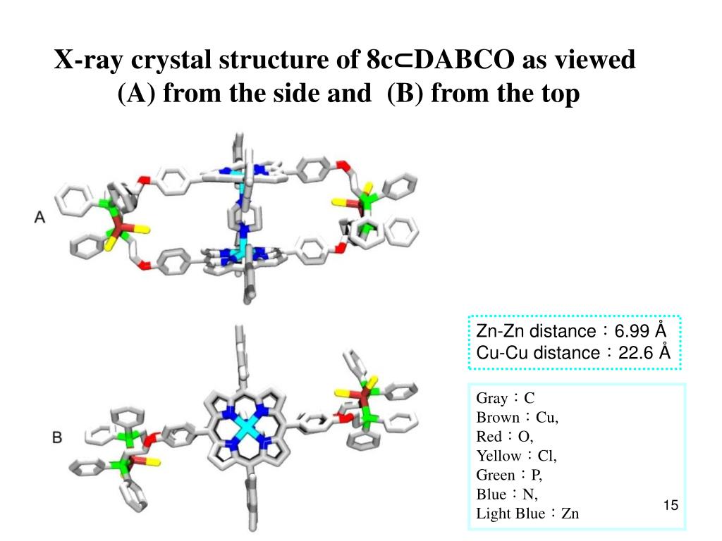 X-ray crystal structure of 15c⊂DABCO as viewed (A) from the side and (B) from the top Zn-Zn distance:7.05 Å Cu-Cu distance:22.38 Å Gray:C Brown:Cu, Red:O, Yellow:Cl, Green:P, Blue:N, Light Blue:Zn