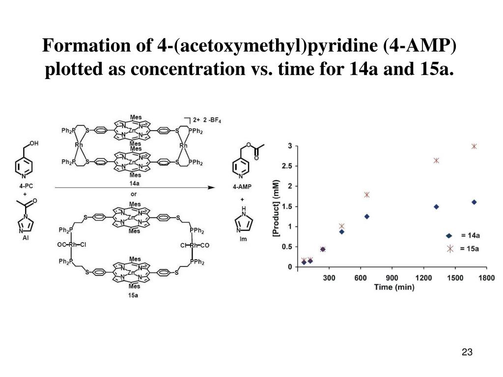 Formation of 4-(acetoxymethyl)pyridine (4-AMP) plotted as concentration vs. time for [Zn(TPP) + 16a] and [Zn(TPP) + 16b]
