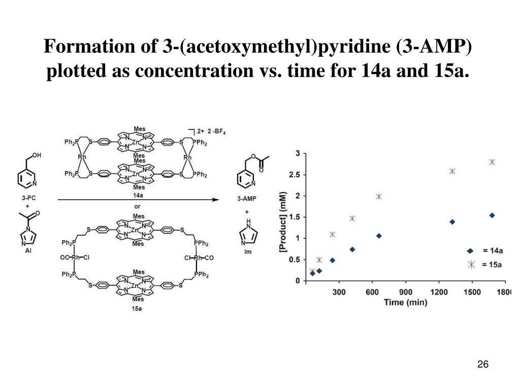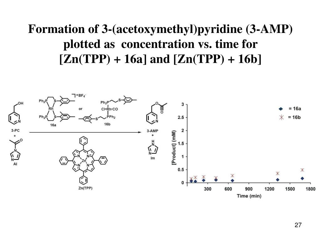 Formation of 3-(acetoxymethyl)pyridine (3-AMP) plotted as concentration vs. time for [Zn(TPP) + 16a] and [Zn(TPP) + 16b]