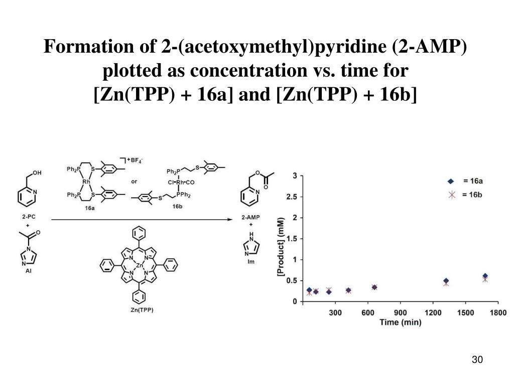Formation of 2-(acetoxymethyl)pyridine (2-AMP) plotted as concentration vs. time for [Zn(TPP) + 16a] and [Zn(TPP) + 16b]