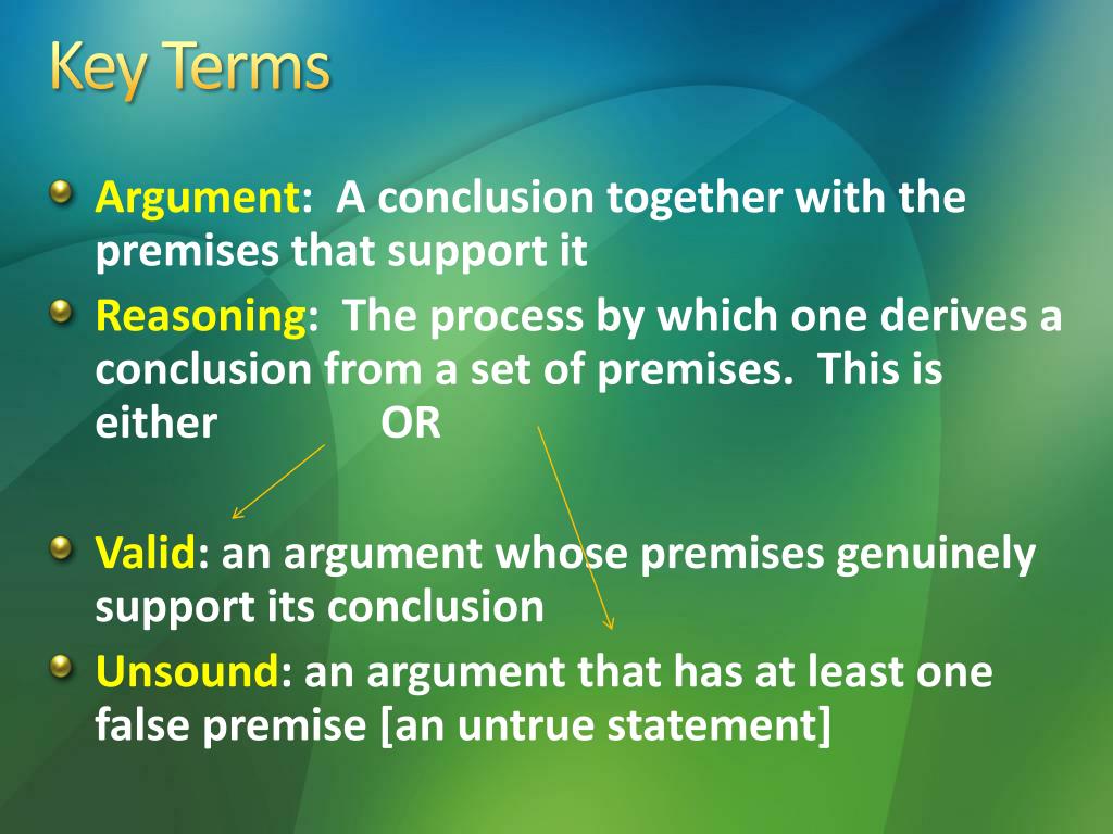 Key Terms • Argument: A conclusion together with the premises that support it • Reasoning: The process by which one derives a conclusion from a set of premises. This is either OR • Valid: an argument whose premises genuinely support its conclusion • Unsound: an argument that has at least one false premise [an untrue statement]