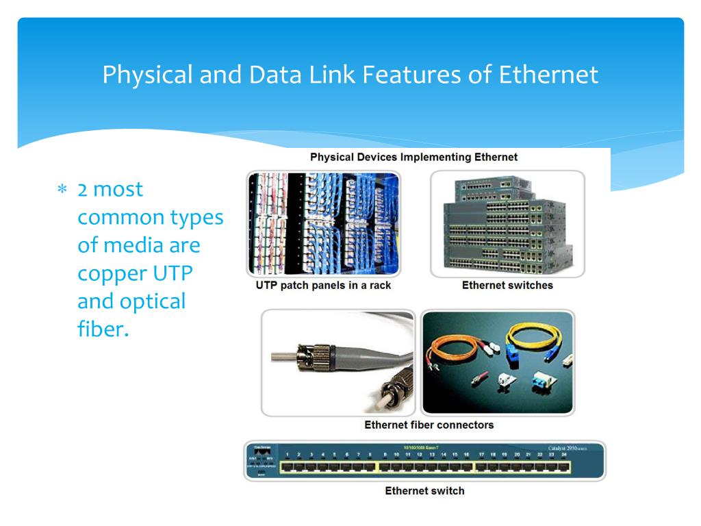 Physical and Data Link Features of Ethernet 2 most common types of media are copper UTP and optical fiber.