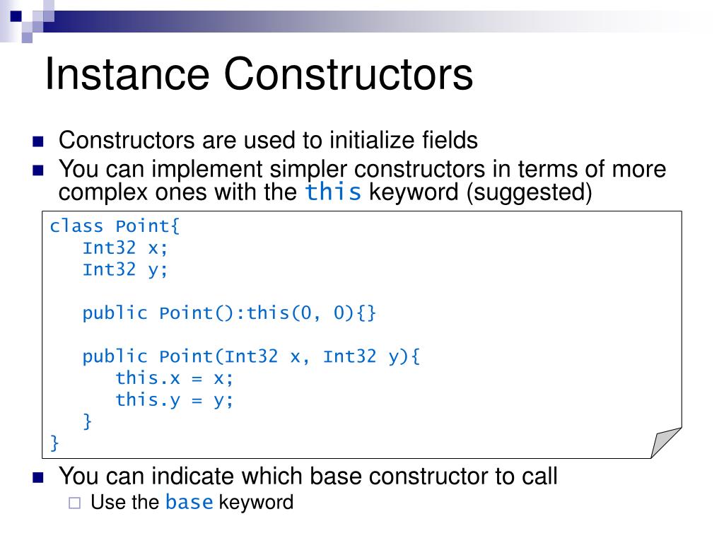 Instance Constructors • Constructors are used to initialize fields • You can implement simpler constructors in terms of more complex ones with the this keyword (suggested) • You can indicate which base constructor to call • Use the base keyword class Point{ Int32 x; Int32 y; public Point():this(0, 0){} public Point(Int32 x, Int32 y){ this.x = x; this.y = y; } }