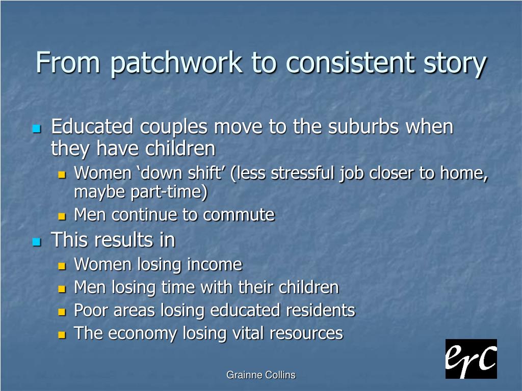 From patchwork to consistent story • Educated couples move to the suburbs when they have children • Women ‘down shift’ (less stressful job closer to home, maybe part-time) • Men continue to commute • This results in • Women losing income • Men losing time with their children • Poor areas losing educated residents • The economy losing vital resources Grainne Collins