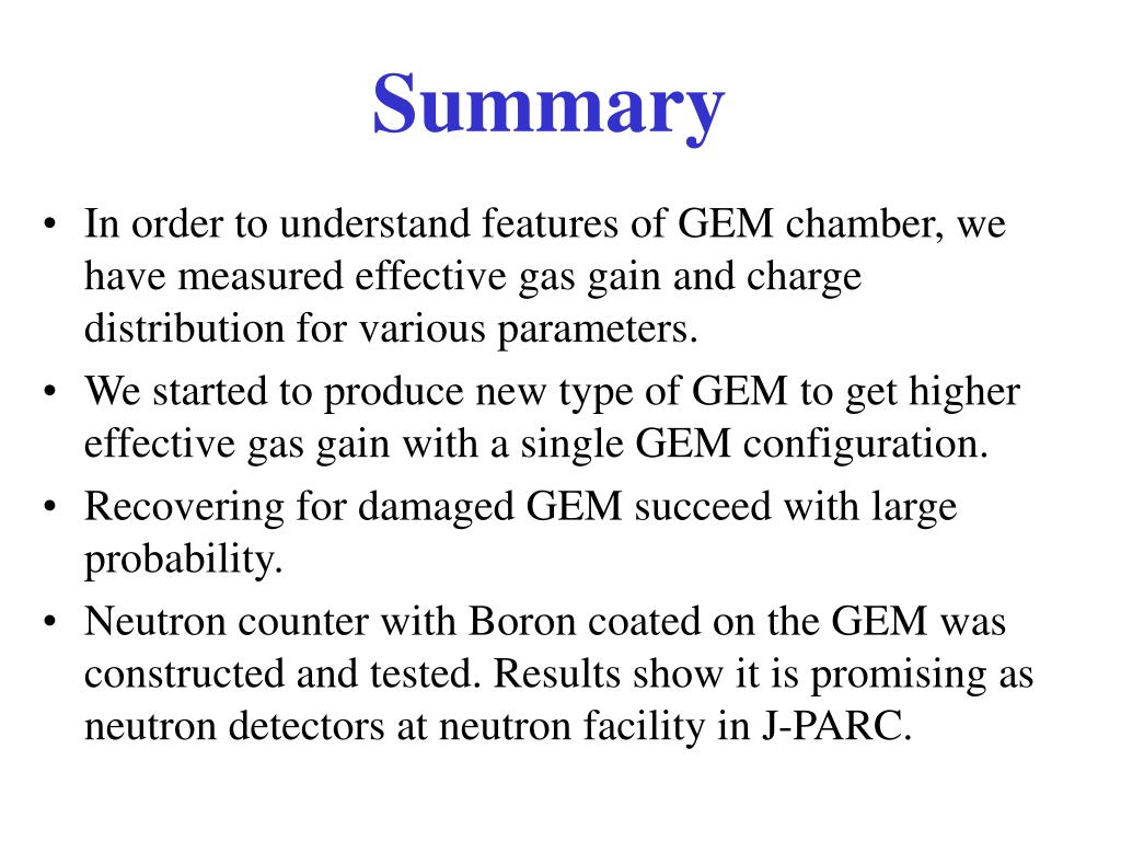 Summary • In order to understand features of GEM chamber, we have measured effective gas gain and charge distribution for various parameters. • We started to produce new type of GEM to get higher effective gas gain with a single GEM configuration. • Recovering for damaged GEM succeed with large probability. • Neutron counter with Boron coated on the GEM was constructed and tested. Results show it is promising as neutron detectors at neutron facility in J-PARC.