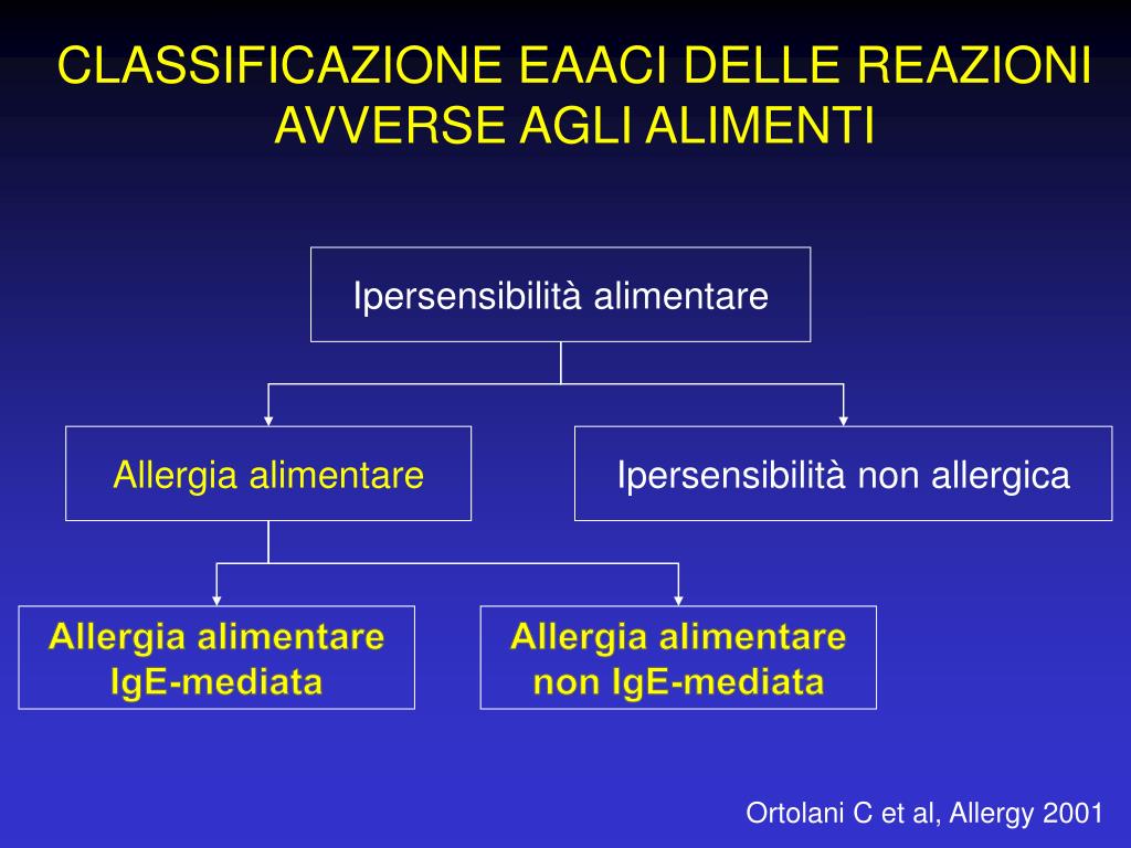 CLASSIFICAZIONE EAACI DELLE REAZIONI AVVERSE AGLI ALIMENTI Ipersensibilità alimentare Allergia alimentare Ipersensibilità non allergica Allergia alimentare IgE-mediata Allergia alimentare non IgE-mediata Ortolani C et al, Allergy 2001