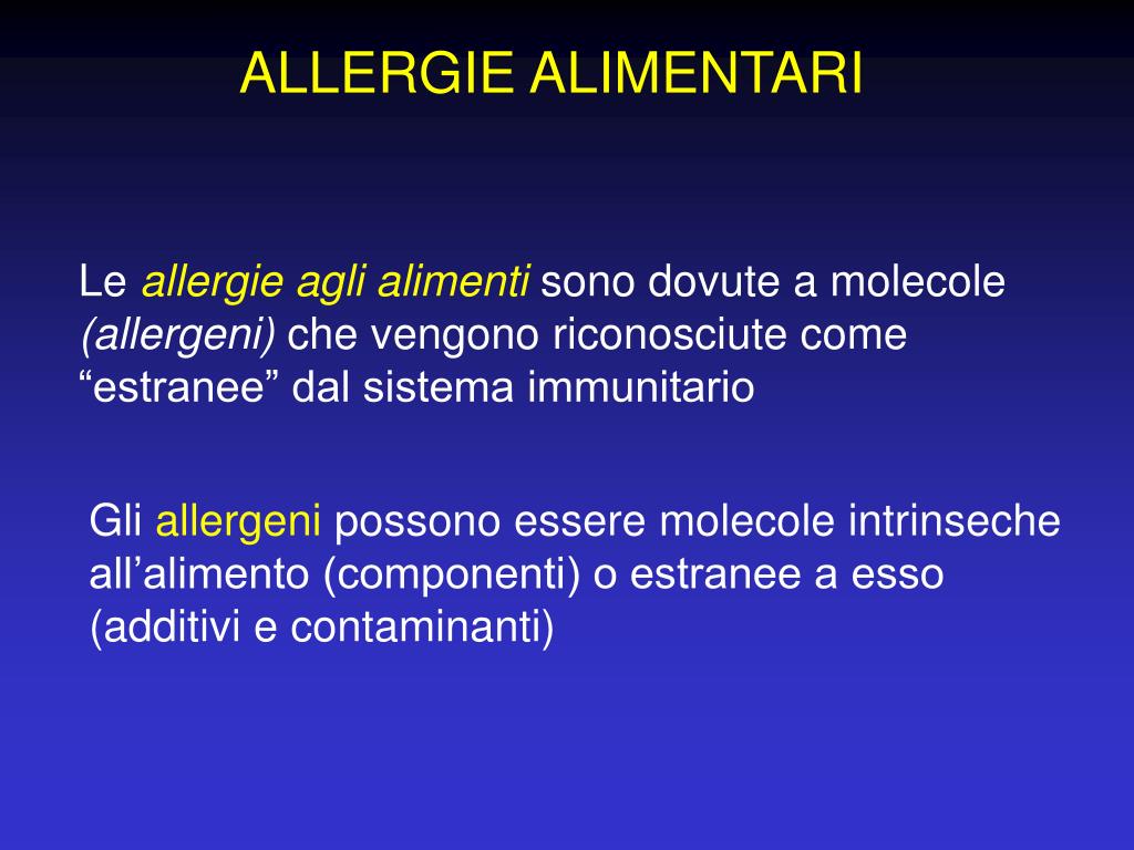 ALLERGIE ALIMENTARI Le allergie agli alimenti sono dovute a molecole (allergeni)che vengono riconosciute come “estranee” dal sistema immunitario Gli allergeni possono essere molecole intrinseche all’alimento (componenti) o estranee a esso (additivi e contaminanti)