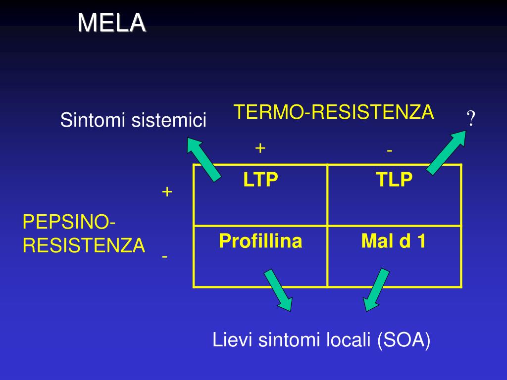 MELA TERMO-RESISTENZA ? Sintomi sistemici + - + PEPSINO-RESISTENZA - Lievi sintomi locali (SOA)