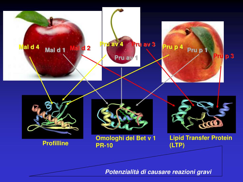 Pru av 4 Pru av 3 Pru p 4 Mal d 4 Mal d 2 Mal d 1 Pru p 1 Pru p 3 Pru av 1 Lipid Transfer Protein (LTP) Omologhi del Bet v 1 PR-10 Profilline Potenzialità di causare reazioni gravi