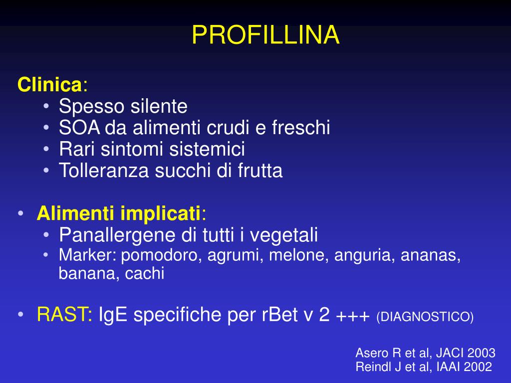 PROFILLINA • Clinica: • Spesso silente • SOA da alimenti crudi e freschi • Rari sintomi sistemici • Tolleranza succhi di frutta • Alimenti implicati: • Panallergene di tutti i vegetali • Marker: pomodoro, agrumi, melone, anguria, ananas, banana, cachi • RAST: IgE specifiche per rBet v 2 +++ (DIAGNOSTICO) • Asero R et al, JACI 2003 • Reindl J et al, IAAI 2002