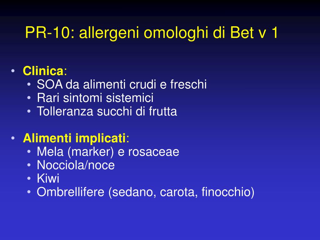 PR-10: allergeni omologhi di Bet v 1 • Clinica: • SOA da alimenti crudi e freschi • Rari sintomi sistemici • Tolleranza succhi di frutta • Alimenti implicati: • Mela (marker) e rosaceae • Nocciola/noce • Kiwi • Ombrellifere (sedano, carota, finocchio)