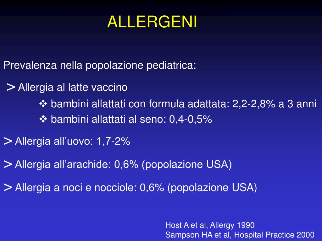 ALLERGENI Prevalenza nella popolazione pediatrica: > Allergia al latte vaccino bambini allattati con formula adattata: 2,2-2,8% a 3 anni bambini allattati al seno: 0,4-0,5% > Allergia all’uovo: 1,7-2% > Allergia all’arachide: 0,6% (popolazione USA) > Allergia a noci e nocciole: 0,6% (popolazione USA) Host A et al, Allergy 1990 Sampson HA et al, Hospital Practice 2000