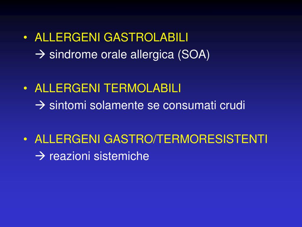 ALLERGENI GASTROLABILI sindrome orale allergica (SOA) • ALLERGENI TERMOLABILI sintomi solamente se consumati crudi • ALLERGENI GASTRO/TERMORESISTENTI reazioni sistemiche