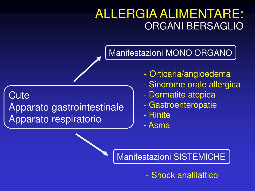ALLERGIA ALIMENTARE:ORGANI BERSAGLIO Manifestazioni MONO ORGANO • Orticaria/angioedema • Sindrome orale allergica • Dermatite atopica • Gastroenteropatie • Rinite • Asma Cute Apparato gastrointestinale Apparato respiratorio Manifestazioni SISTEMICHE • Shock anafilattico