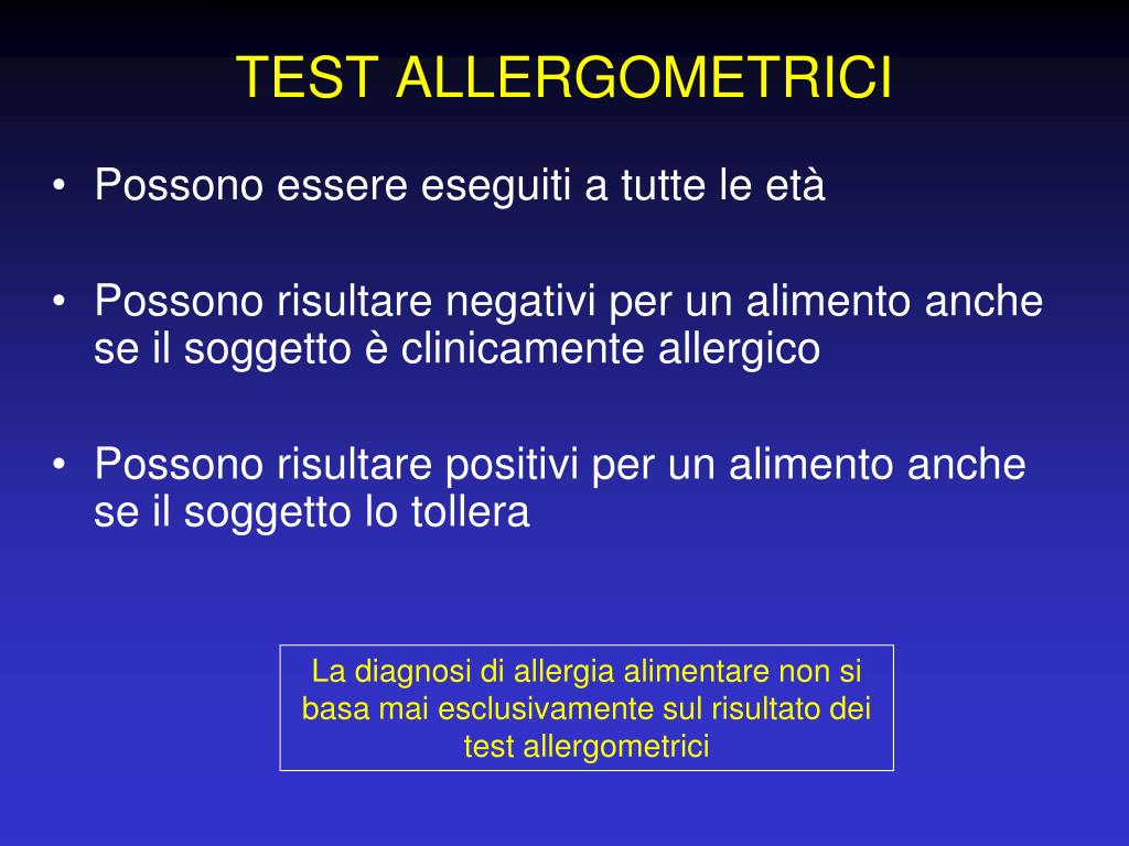 TEST ALLERGOMETRICI • Possono essere eseguiti a tutte le età • Possono risultare negativi per un alimento anche se il soggetto è clinicamente allergico • Possono risultare positivi per un alimento anche se il soggetto lo tollera La diagnosi di allergia alimentare non si basa mai esclusivamente sul risultato dei test allergometrici