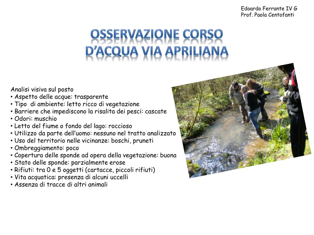 Edoardo Ferrante IV G Prof. Paola Centofanti. Osservazione corso d’acqua via apriliana. Analisi visiva sul posto Aspetto delle acque: trasparente Tipo di ambiente: letto ricco di vegetazione Barriere che impediscono la risalita dei pesci: cascate Odori: muschio